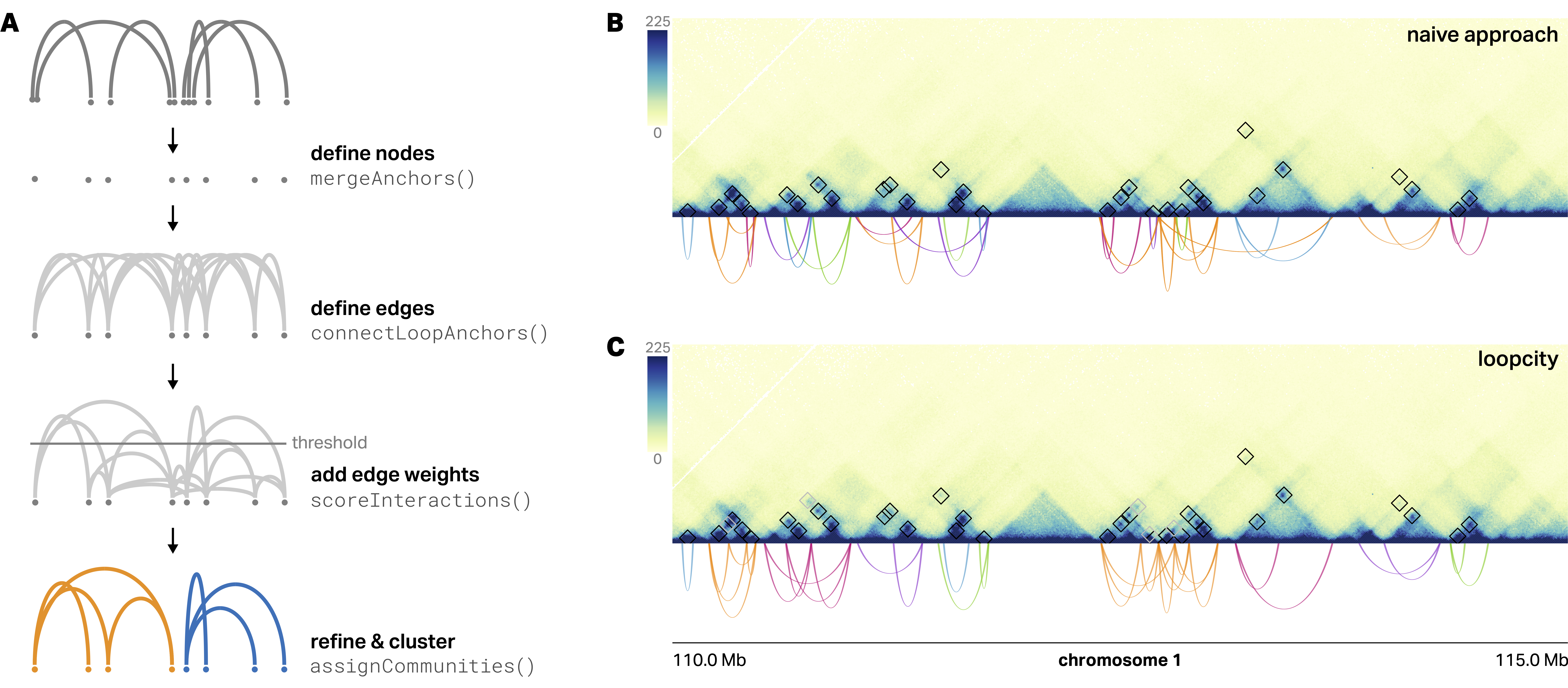 Loopcity detects chromatin communities from Hi-C data. (a) Schematic overview of the main loopcity functions. (From top to bottom) Nearby anchors are merged to create network nodes, edges are added to connect all nearby nodes, edge weights are added based on enrichment over local background, edges with low weights are removed and chromatin communities are assigned using network clustering algorithms. (b) Contact frequency map of Hi-C data from K562 cells. Loops are annotated as black diamonds. Chromatin communities derived using a naive approach—where all loops with overlapping anchors are merged into a single community without anchor refinement—are shown via colored arches, with each color representing a different community. (b) The same Hi-C map is shown and loop annotations are depicted. Loops added by loopcity are annotated as grey diamonds. Chromatin communities derived using loopcity are shown via colored arches, with each color representing a different community.